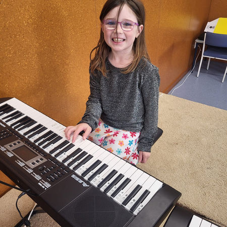 Every week, Michelle comes to teach us how to play our instruments: keyboard, uklele, guitar and electronic drums. She shows us how to play the notes, beat and our finger drills. We always look forward to it because we can play and have fun. We want to thank Michelle for the effort to get to us every week.